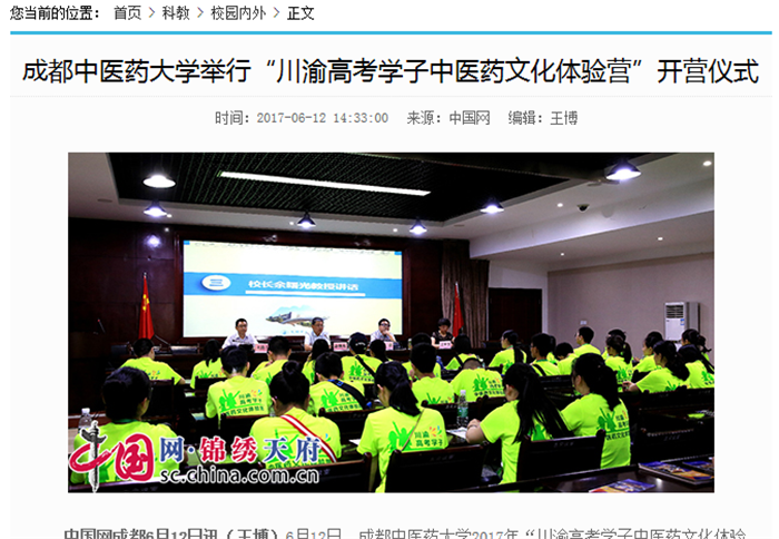中国网成都6月12日讯(王博)6月12日,beat365平台唯一官网2017年“川渝高考学子中医药文化体验营”开营仪式在温江校区举行,来自四川省、重庆市29所中学的40名同学,开始了他们中医药文化的奇妙之旅。校长余曙光教授,校党委副书记、副校长沈涛教授,教务处副处长王世宇出席开营仪式,招生就业处处长叶军主持开营仪式。