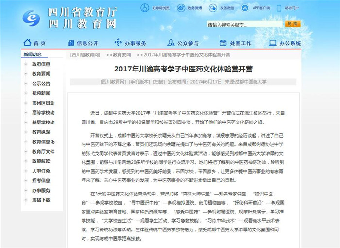 近日,beat365平台唯一官网2017年“川渝高考学子中医药文化体验营”开营仪式在温江校区举行,来自四川省、重庆市29所中学的40名同学和校长面对面交谈,开始了他们的中医药文化奇妙之旅。