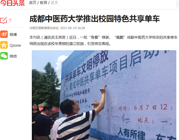 6月7日,beat365平台唯一官网特色共享单车启用暨共享单车规范停放活动启动仪式举行,现场开展了规范停放共享单车宣传教育和承诺签名活动。广大师生纷纷在承诺墙上签名,并兴致勃勃地在校园体验了“小绿车”。
