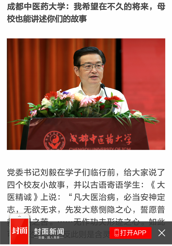 党委书记刘毅在学子们临行前,给大家说了四个校友小故事,并以古语寄语学生:《大医精诚》上说:“凡大医治病,必当安神定志,无欲无求,先发大慈恻隐之心,誓愿普救含灵之苦。……无作功夫形迹之心。如此可为苍生大医,反此则是含灵巨贼。”并说:“希望你们做一个心怀梦想的人,一个心存坚守的人,一个心有感恩的人,一个心系苍生的人。我希望在不久的将来,母校也能讲述你们的故事!”
