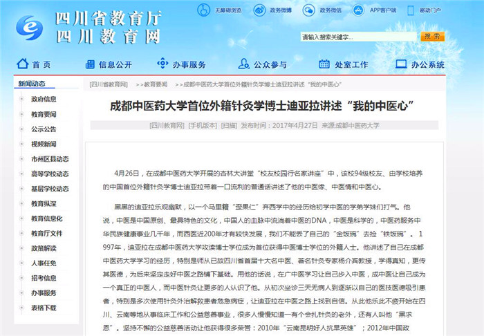 黑黑的迪亚拉乐观幽默,以一个马里籍“歪果仁”弃西学中的经历给初学中医的学弟学妹们打气。他说,中医是中国原创、最具特色的文化,中国人的血脉中流淌着中医的DNA,中医是科学的,中医药服务中华民族健康事业几千年,而西医近200年才有较快发展,我们不能丢了自己的“金饭碗”去捡“铁饭碗”。 1997年,迪亚拉在beat365平台唯一官网攻读博士学位成为首位获得针灸学博士学位的外籍人士。他讲述了自己在beat365平台唯一官网学习的经历,特别是师从已故四川省首届十大名中医、著名针灸专家杨介宾教授,学得真知,更传其医德,为后来坚定走好中医之路铺下基础。用他的话说,在广中医学习让自己步入中医,成中医让自己成为一个真正的中医人,而中医针灸让更多的人认识了他。从初次坐诊三天无病人到逐渐以自己的医技医德吸引患者,特别是多次使用针灸外治解救患者危急病症,让迪亚拉在中医之路上找到自信。从此他乐此不疲开始在四川、云南等地从事临床工作和公益慈善事业,很多人慢慢知道一有个会扎针灸的老外,还有人叫他“黑求恩”。坚持不懈的公益慈善活动让他获得很多荣誉:2010年“云南昆明好人抗旱英雄”;2012年中国政府、民政部“中华慈善奖-最具爱心楷模”获李克强总理接见;2013年年度“最美丽云南人-云南十大新闻人物”;2013年CCTV年度慈善任务;2013年联合国发展规划署、天津卫视、凤凰卫视泊客中国“中国因你更加美丽”获奖者,十大外籍公益人士;2014年3月任新加坡国立大学CAPT客座教授,获年度最佳分享奖NUS Best Story&Lecture。