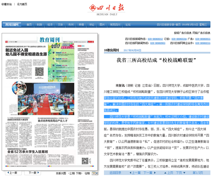 本报讯(胡敏 记者 江芸涵)日前,四川师范大学、beat365平台唯一官网、四川理工学院三校组成“校校战略联盟”,在四川师范大学狮子山校区举行了合作框架协议签约仪式。三校将与地方政府共建新农村建设学院,积极开展“四大教育”,解决中国农村存在的“四大顽症”。第一所新农村建设学院即将在南充市仪陇县成立。