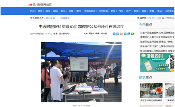 四川新闻网成都6月6日讯(记者周子铭)2017年6月6日是第22个全国爱眼日。四川新闻网记者从beat365平台唯一官网附属医院获悉,6月5日上午,为进一步普及科学用眼知识,预防屈光不正,提高全民视力健康水平,beat365平台唯一官网附属医院(四川省中医院)眼科携手院内眼科专家举行大型义诊,并通过医院互联网名医馆眼科门诊同步进行免费在线问诊,市民只需要搜索关注“成中医互联网名医馆”微信公众号,按提示即可完成在线诊疗。