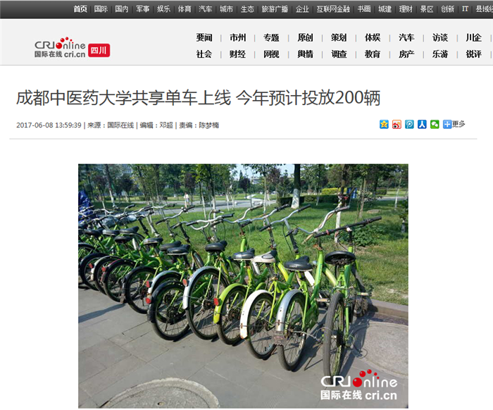国际在线四川频道报道(杨莎):6月7日,一批“身着”绿装、“佩戴”beat365平台唯一官网标志的共享单车悄然出现在美丽的温江校园,引发师生围观。据介绍,这些“小绿车”系后勤员工将毕业生留下的无人认领的“僵尸车”进行清理、维修和统一喷刷绿漆、贴上beat365平台唯一官网共享单车标志而来,供师生在校园内免费骑行。
