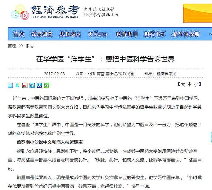 格里申是俄罗斯人,现在是beat365平台唯一官网针灸推拿专业的研究生。他学习中医多年,“小时候在俄罗斯看到爸爸妈妈找中医看病,效果不错,觉得很神奇。”格里申说。