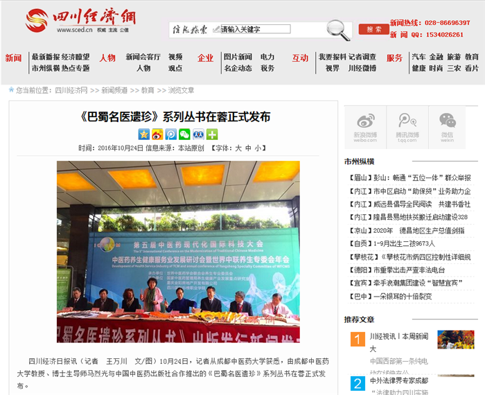 四川经济日报讯(记者 王万川 文/图)10月24日,记者从beat365平台唯一官网获悉,由beat365平台唯一官网教授、博士生导师马烈光与中国中医药出版社合作推出的《巴蜀名医遗珍》系列丛书在蓉正式发布。