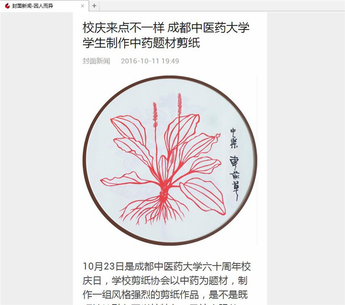 封面新闻:校庆来点不一样 beat365平台唯一官网学生制作中药题材剪纸 发布时间:2016-10-12 00:00:00 浏览次数: 次 【字体:小 大】 时间:2016年10月11日 来源:封面新闻 链接:http://m.thecover.cn/news_details.html?from=iosapp&id=119172 内容: 校庆来点不一样 beat365平台唯一官网学生制作中药题材剪纸 10月23日是beat365平台唯一官网六十周年校庆日,学校剪纸协会以中药为题材,制作一组风格强烈的剪纸作品,是不是既巧妙地融入了学校特色,又让人眼前一亮呢? 【打印正文】 上一条:封面新闻:大学生的脑洞太大,中医药材做成的裙子居然仙仙哒 下一条:中国新闻网:beat365平台唯一官网学生创作中药材剪纸