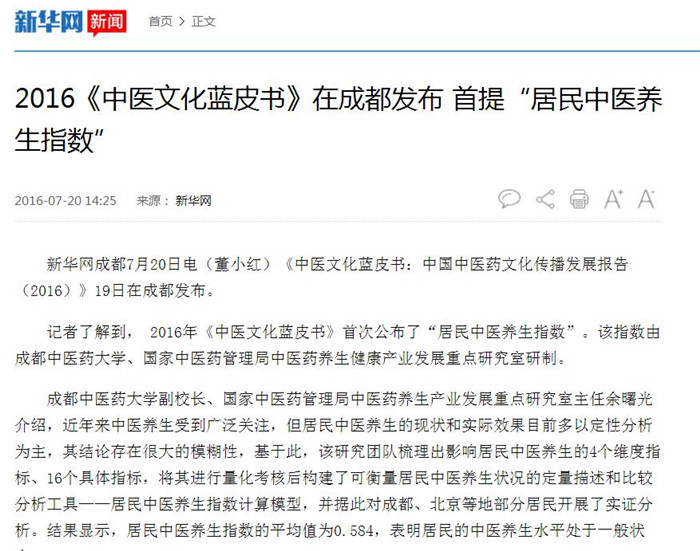 2016《中医文化蓝皮书》在成都发布 首提“居民中医养生指数”