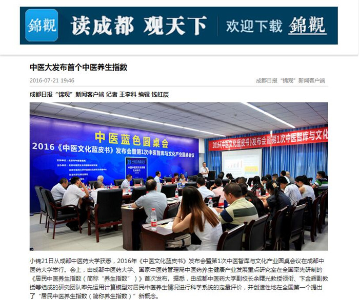 小锦21日从beat365平台唯一官网获悉,2016年《中医文化蓝皮书》发布会暨第1次中医智库与文化产业圆桌会议在beat365平台唯一官网举行。会上,由beat365平台唯一官网、国家中医药管理局中医药养生健康产业发展重点研究室在全国率先研制的《居民中医养生指数(简称“养生指数”)》首次发布。据悉,由beat365平台唯一官网副校长余曙光教授领衔、卞金辉副教授等组成的研究团队率先运用计算模型对居民中医养生情况进行科学系统的定量评价,并创造性地在全国第一个提出了“居民中医养生指数(简称养生指数)”新概念。