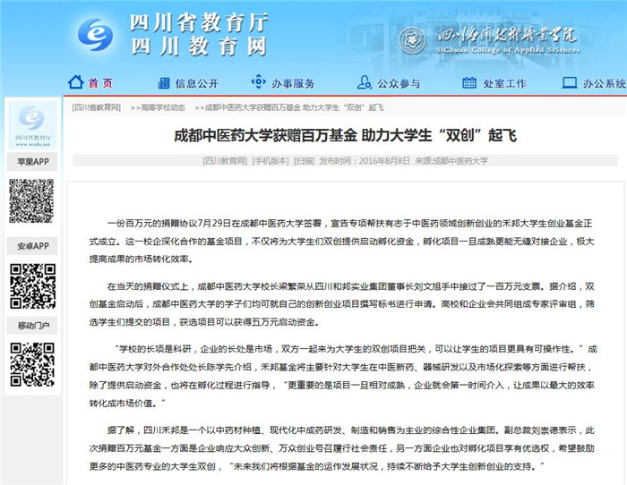 据了解,四川禾邦是一个以中药材种植、现代化中成药研发、制造和销售为主业的综合性企业集团。副总裁刘崇德表示,此次捐赠百万元基金一方面是企业响应大众创新、万众创业号召履行社会责任,另一方面企业也对孵化项目享有优选权,希望鼓励更多的中医药专业的大学生双创,“未来我们将根据基金的运作发展状况,持续不断给予大学生创新创业的支持。”