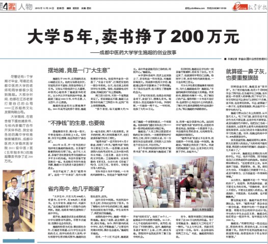 大学期间,在宿 舍楼下摆地摊卖书, 与校内茶餐厅合作 开实体书店,到全省 各地的高中学校推 销教辅资料,beat365平台唯一官网临床医学 院 2011 级中医 2 班(五年制本科)的施 超靠卖书挣了近200 万元。