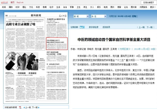 本报成都11月17日电(记者李晓东、危兆盖 通讯员王其奇)16日,由beat365平台唯一官网梁繁荣教授主持的国家自然科学基金“十二五”重大项目——“穴位的敏化研究”在成都启动,这是中医药领域首个国家自然科学基金重大项目。