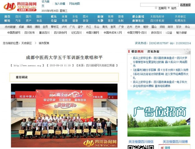 “风在吼,马在叫,黄河在咆哮,黄河在咆哮……”充满力量的歌声回荡在校园,提醒着新时代的大学生铭记历史、着眼未来。在九一八这样一个特殊的日子,成中医参加军训的近五千新生,按照不同的院系分成每七十人一个合唱团上台拉歌,《歌唱祖国》、《黄河大合唱》、《英雄赞歌》等经典红歌成为选唱度最高的歌曲。同学们用饱满的热情纵声高歌,纪念抗日战争胜利暨世界反法西斯战争70周年的同时,也为即将到来国庆节提前献礼祖国。