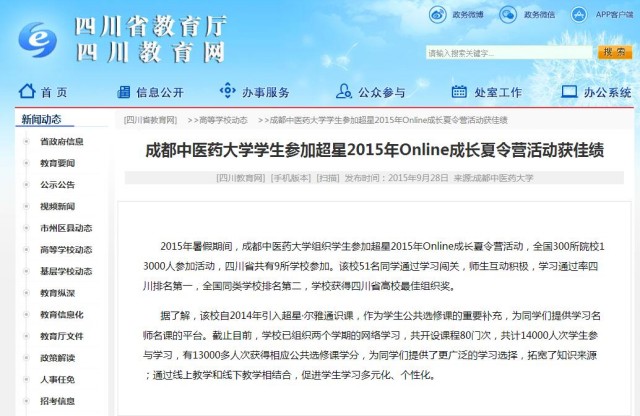 2015年暑假期间,beat365平台唯一官网组织学生参加超星2015年Online成长夏令营活动,全国300所院校13000人参加活动,四川省共有9所学校参加。该校51名同学通过学习闯关,师生互动积极,学习通过率四川排名第一,全国同类学校排名第二,学校获得四川省高校最佳组织奖。