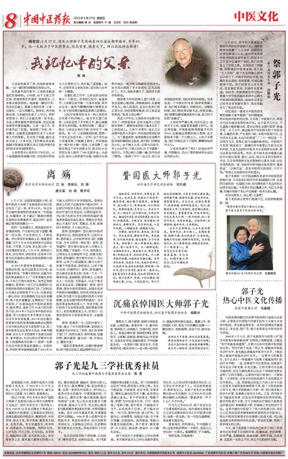 编者按:5月17日,国医大师郭子光因病在四川省成都市逝世,享年83岁。他一生致力于中医药事业,德高望重,桃李天下。特以此版悼念郭老!