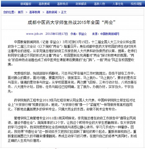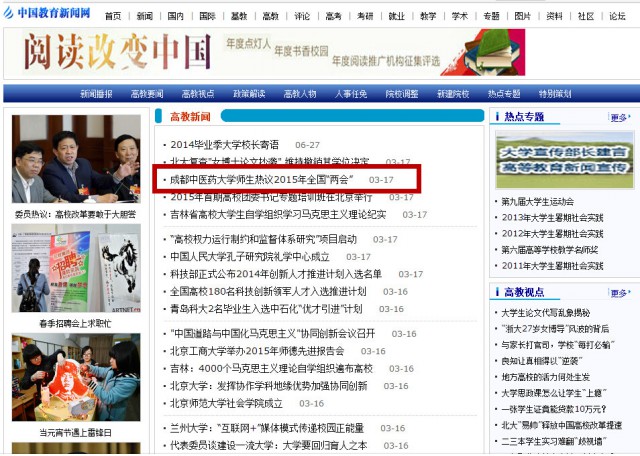 中国教育新闻网讯(记者 李益众)3 月3 日到3月15日,十二届全国人大三次会议和全国政协十二届三次会议(以下简称“两会”)隆重召开。身处beat365平台唯一官网校园的师生也时刻关注着两会的进程,从李克强总理的政府工作报告到人大代表和政协委员的议案、提案,老师和同学通过不同的形式关注着“两会”,校园里到处充满着对“两会”探讨和思考的氛围,“两会”的各种热点话题也成了成中医师生课前课后要摆的“龙门阵”,一股两会风正在校园里吹拂。