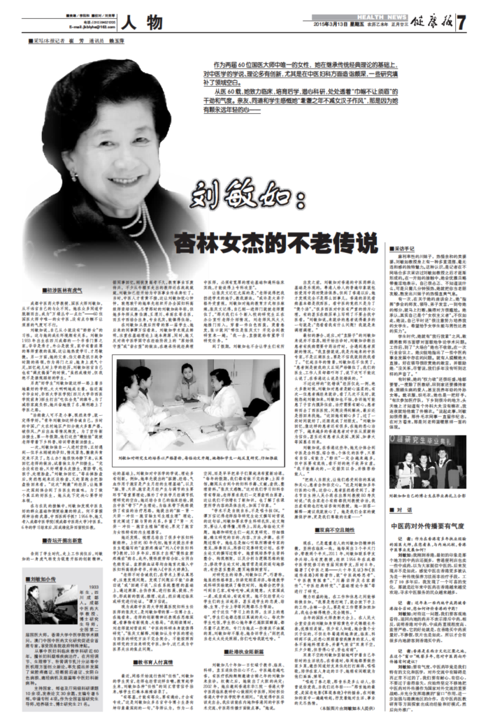 现在,已是耄耋老人的刘敏如仍精神抖擞,坚持在临床一线。她每周出3个半天门诊,带教两个半天。2011年,刘敏如联系学友李兴培、马有度教授,组织1956年在成都中医学院修习的首届同班学友,历时8年,编著了《中医之路——六十年见证》和《医道传承路》两部著作,就“中医战略思考”、“中医教育探索”、“川籍宗师及名家薪传”、“中医经典研究”、“基础理论今探”等进行了研究。