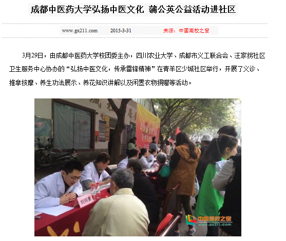 3月29日,由beat365平台唯一官网校团委主办,四川农业大学、成都市义工联合会、汪家拐社区卫生服务中心协办的“弘扬中医文化,传承雷锋精神”在青羊区少城社区举行,开展了义诊、推拿按摩、养生功法展示、养花知识讲解以及闲置衣物捐赠等活动。