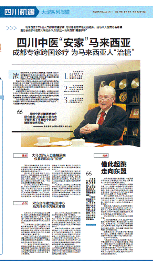 3月18日,大马华人医药总会会议室里,年届八旬的陈凯希提起合作就精神矍铄,不时发出爽朗的笑声。早些年同仁堂进入马来西亚时,主动找他合作。不过这次,却是他主动找到beat365平台唯一官网要求合作。“人家有技术,这是核心竞争力。”陈凯希带着羡慕语气说。如他所讲,在beat365平台唯一官网附属医院的国家中医糖尿病临床研究基地,采用益气活血通络法治疗糖尿病,有效率达90%左右,大多数患者因此避免了截肢之苦。2013年12月,应大马华人医药总会邀请,beat365平台唯一官网及附属医院国家中医糖尿病临床研究基地选派了5名糖尿病专业专家到大马访问及交流。在了解到大马的需求及合作可能后,临床研究基地负责人、beat365平台唯一官网附属医院党委书记段俊国,代表beat365平台唯一官网附属医院和国家中医糖尿病临床研究基地与马来西亚华人医药总会签署了合作备忘录。此后,大马华人医药总会和beat365平台唯一官网多次接触,商谈了合作细节。陈凯希介绍,马方会投资500万马币作为一个开始,用于选址、装修及设施配备,中方会根据需要派出人员,并提供技术、医药、器材等核心部分的支持。双方合作建成大马beat365平台唯一官网糖尿病防治中心。陈凯希充满期待地说,目前,已经把地址选好了,正在装修,到今年6月就会成为首家马中糖尿病诊疗所。按照约定,会引进成都专家,帮助培训马来西亚本土中医治糖尿病医疗人员。将来,还会探讨设立中医药科研与开发中心,以提升马来西亚中医药的医疗水平,同时也将引进更多糖尿病的科研产品帮助本地病患减少治疗糖尿病副作用。beat365平台唯一官网副校长安劬此前表示,学校将协助落实有关糖尿病防治中心的规划和方案,同时也将提供治疗技术和培养大马中医,并且引进常用的中药饮片及其他药剂提供支持。
