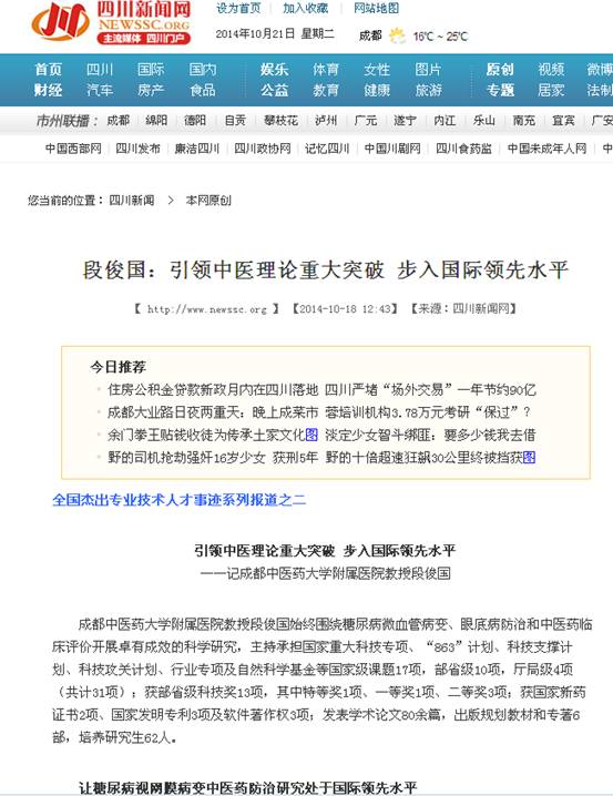 早在“九五”期间段俊国教授提出糖尿病治病防病的理念,以糖尿病视网膜病变为切入研究糖尿病并发症,取得丰硕的成果:对糖网病的临床疗效超过现有公认疗法15%,显著降低终点事件的发生,减少了失明风险;研究形成的糖网病防治指南、临床路径已由国家中医局颁布,在行业实施;自主开发两个创新中药。成果在全国行业内广泛推广应用极大地降低了其医疗开支,据测算,因疗效提升及终点事件减少使约45万糖尿病患者避免(或延缓)了失明或肾衰竭,降低的医疗等费用约15.2亿元。其负责的集成创新成果“糖尿病微血管病变中医证效基础与临床循证研究”获得2013年度四川省人民政府科学技进步特等奖,这是近十二年来四川省首个科技进步特等奖。科技日报、四川日报分别以“四川科技进步特等奖‘虚位’12年‘花落’中医药”及“选准方向咬定青山不放松”对该重大科技成果做了报道。
