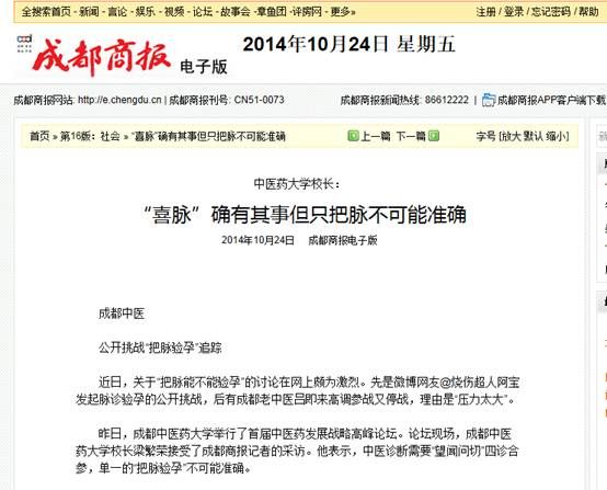 近日,关于“把脉能不能验孕”的讨论在网上颇为激烈。先是微博网友@烧伤超人阿宝发起脉诊验孕的公开挑战,后有成都老中医吕即来高调参战又停战,理由是“压力太大”。