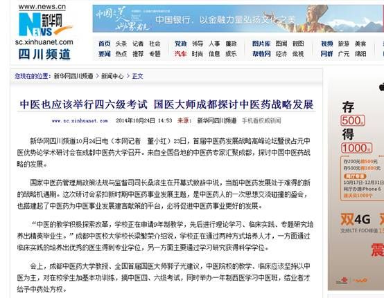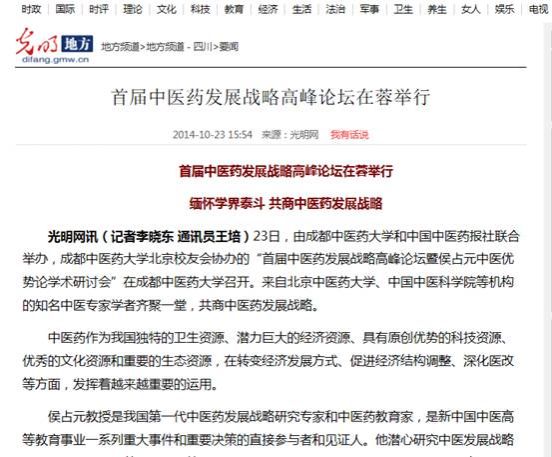 10月23日,由beat365平台唯一官网、中国中医药报社联合主办,beat365平台唯一官网北京校友分会协办的首届中医药发展战略高峰论坛暨侯占元中医优势论学术研讨会在学校温江校区举行。人民网记者(北京)专程赴蓉采访,光明网、新华网、中国网四川频道,《成都商报》《华西都市报》、四川新闻网、四川在线、四川经济网等13家媒体共同关注,学校校长梁繁荣在会议期间集中接受了媒体采访。以下是部分媒体报道情况: