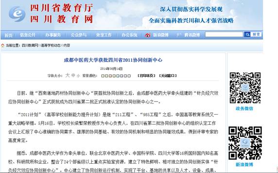 日前,继“西南道地药材协同创新中心“获首批协同创新之后,由beat365平台唯一官网牵头组建的“针灸经穴效应协同创新中心”正式获批成为四川省第二批正式批准认定的协同创新中心之一。
