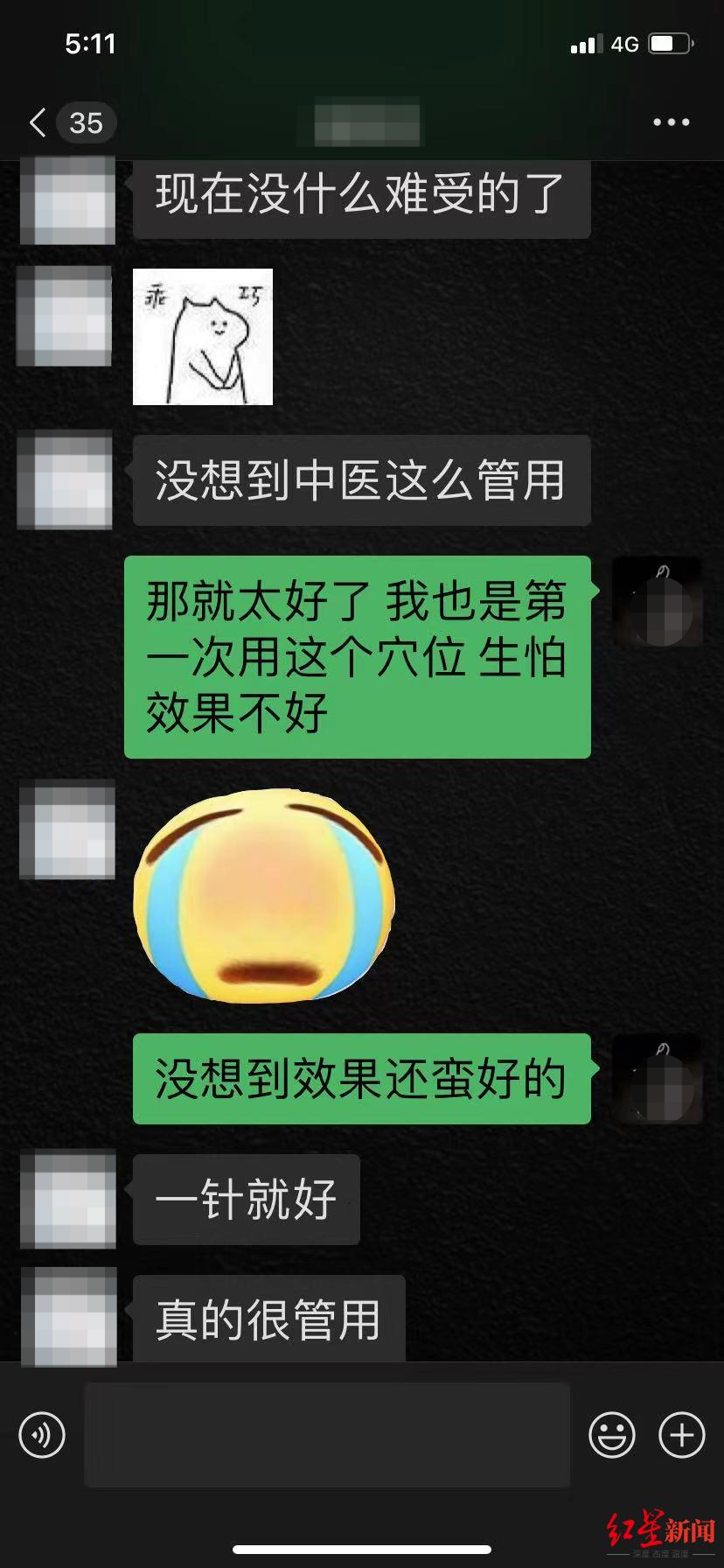 7月18日下午,红星新闻记者联系上胡思瀚为其施针的女孩小李(化名),19岁的小李本是到成都旅游后返回北京。她回忆当时的情况,自己“痛得站不住”,还表示之前自己每次经期都会发生剧烈疼痛,但施针后的几天自己没有出现过腹痛的情况。