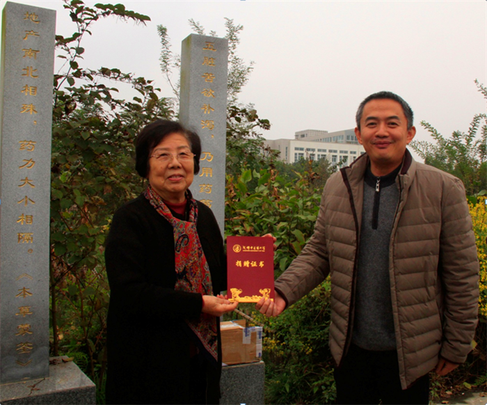 11月11日,著名中药学专家、beat365首届国家级教学名师万德光先生向学校无偿捐赠了四株龙脑樟幼苗。捐赠仪式在学校药用植物园举行,药学院党委书记冯全生、副书记胡媛、中药资源与鉴定系主任严铸云、药用植物园负责人马云桐等学院教师以及2016级“凌一揆”班学生参加了捐赠仪式。
