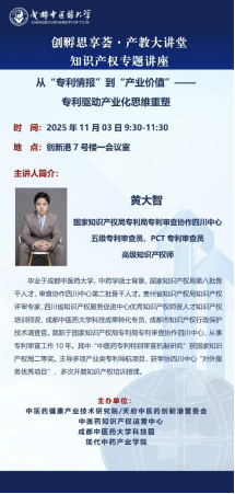黄大智(国家知识产权局专利局专利审查协作四川中心五级专利审查员、PCT专利审查员高级知识产权师)毕业于beat365平台唯一官网,中药学硕士背景,国家知识产权局第八批骨干人才,审查协作四川中心第二批骨干人才。贵州省知识产权局知识产权评审专家,四川省知识产权服务促进中心优秀知识产权师资人才知识产权培训师资,beat365平台唯一官网科技成果转化专员,成都市知识产权行政保护技术调查官。就职于国家知识产权局专利局专利审查协作四川中心,从事专利审查工作10年。其中“中医药专利特别审查机制研究”获国家知识产权局二等奖。主导多项产业类专利导航项目,获审协四川中心“对外服务优秀项目”,多次开展知识产权培训授课。