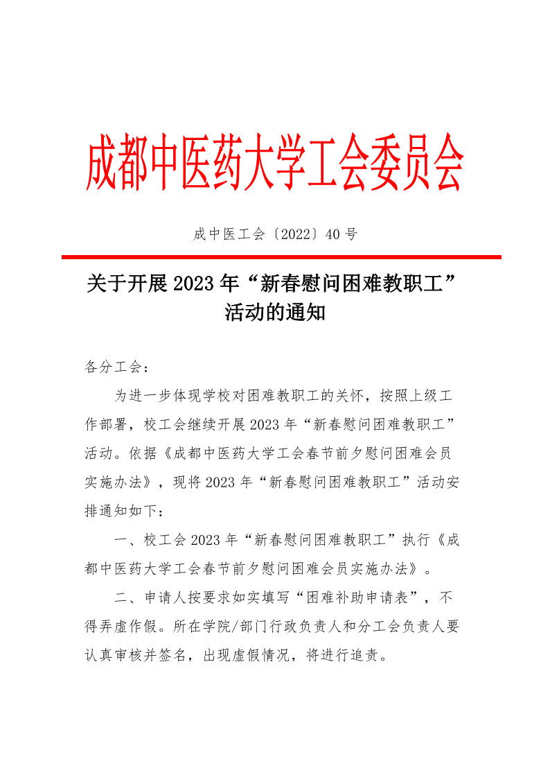 2023年关于开展新春慰问困难教职工的通知