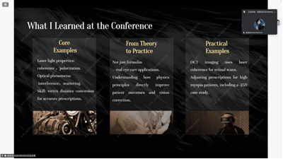 2023级眼视光学专业学生邬俊杰表示,通过国际眼科会议学习,清晰认知到眼科学正朝着精准化、智能化、系统化方向快速发展。在“屈光术后白内障”领域,教授们精准定位误差来源,让复杂手术变得可预测,彰显精准医学核心价值;“AI与可穿戴设备”方面,数字化平台推动优质诊疗资源下沉基层,凸显技术与临床融合的巨大潜力;“干眼”领域研究从“关注干涩”转向“疼痛”神经机制,打破传统认知。他指出,未来眼科视光学发展,需多学科交叉与创新思维支撑。